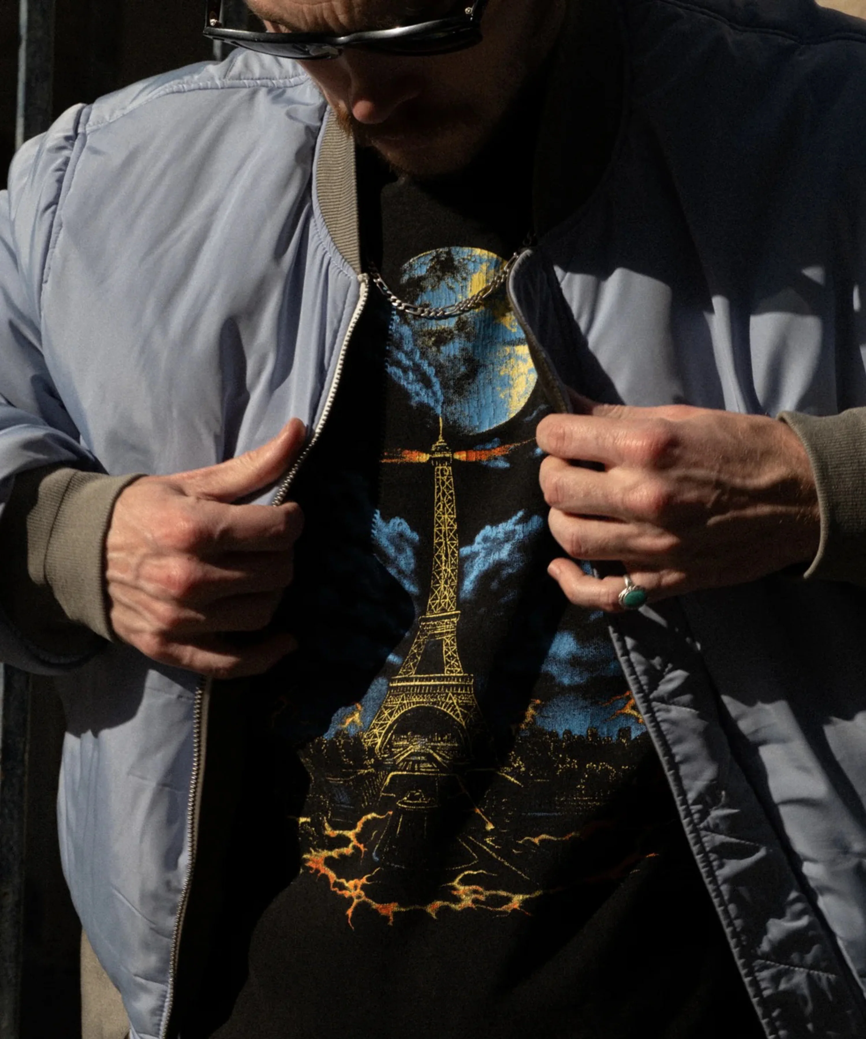 Brut Archives Eiffel Tower graphics screen printed on front and sleeves.